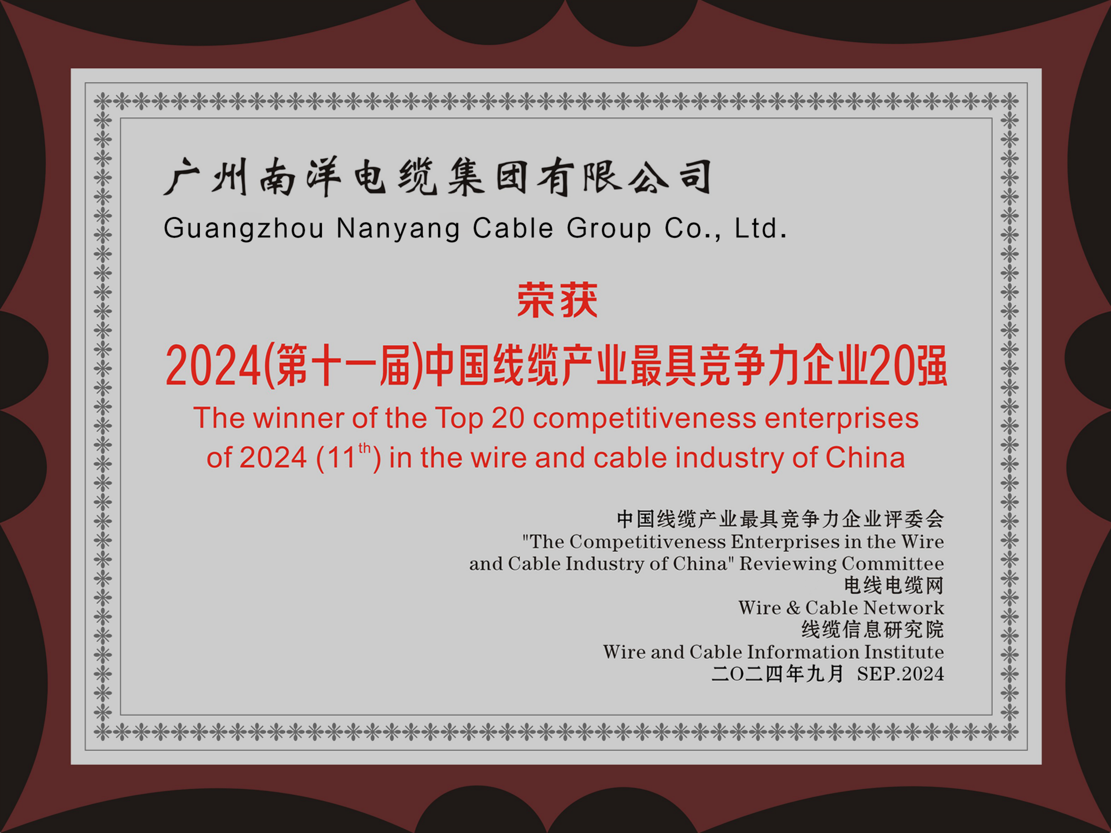 • 2024年度中國線纜行業最具競爭力企業20強證書